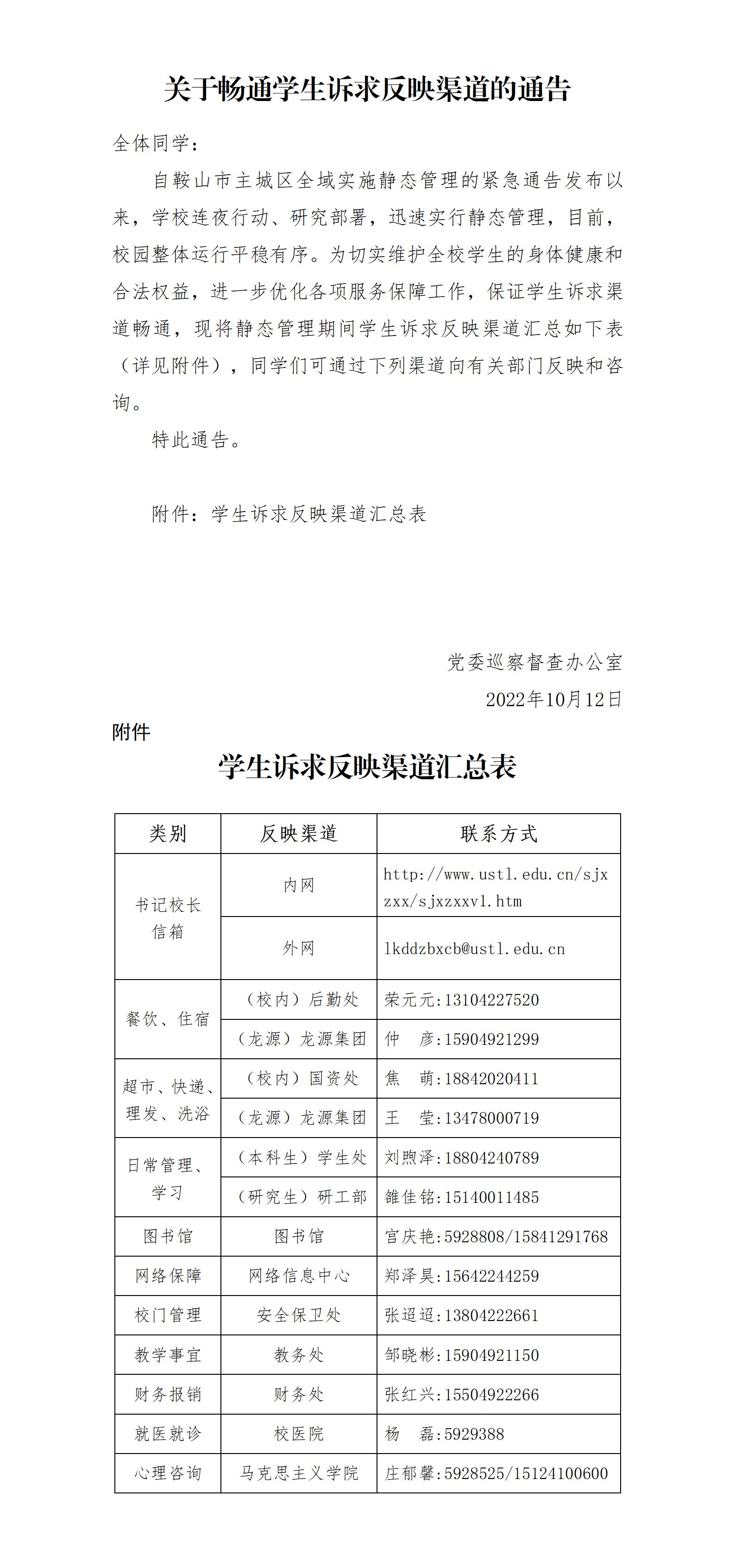 关于畅通学生诉求反映渠道的通告