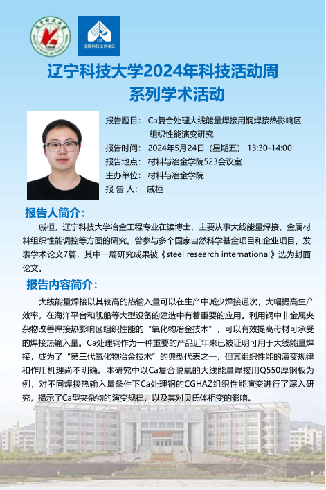 【科技活动周学术预告】Ca复合处理大线能量焊接用钢焊接热影响区组织性能演变研究-辽宁科技 - 九九精品视频一区在线久久久久久久久久毛片精品美女|国产99久久久久久免费看|中文精品99久久国产|国产69精品久久久久9999|精品久久久久久中文字幕无码|亚洲熟妇无码久久精品国产精品99|精品国产天堂综合一区在线官网