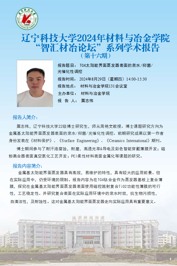 学术预告:TC4太阳能界面蒸发器表面的亲水/抑菌/光催化性调控-辽宁科技 - 九九精品视频一区在线久久久久久久久久毛片精品美女|国产99久久久久久免费看|中文精品99久久国产|国产69精品久久久久9999|精品久久久久久中文字幕无码|亚洲熟妇无码久久精品国产精品99|精品国产天堂综合一区在线官网
