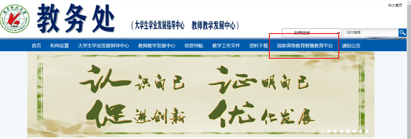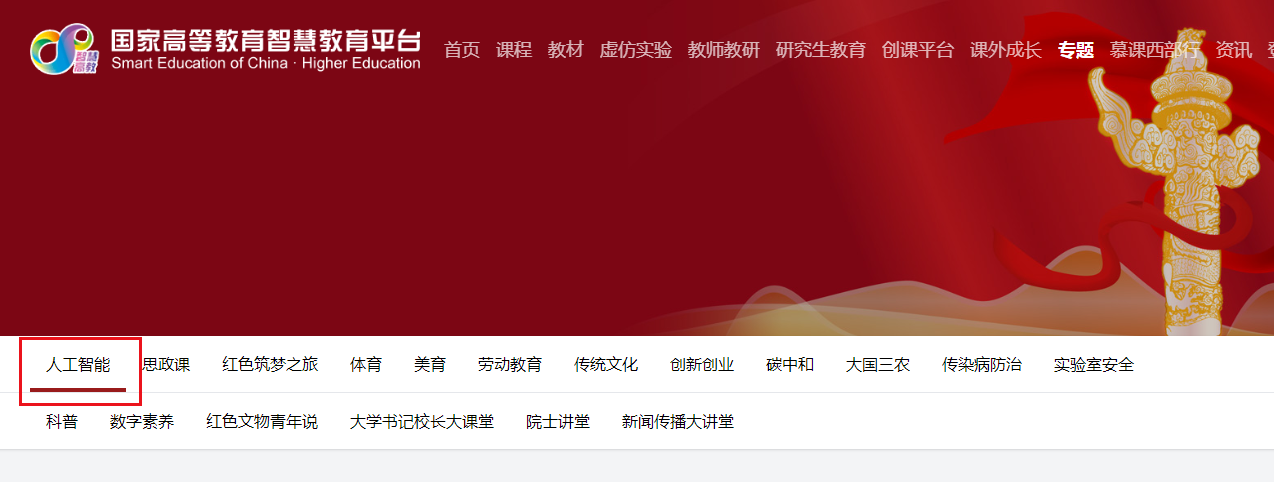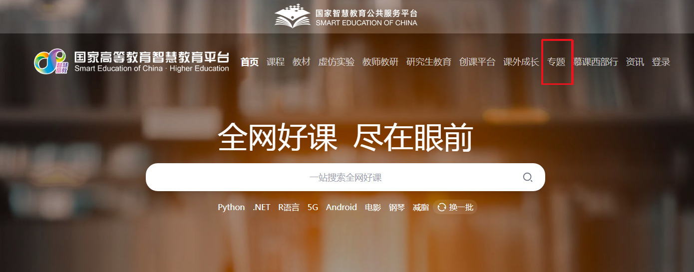 第一步,登录国家高等教育智慧教育平台,并点击“专题”,地址为:https://higher.smartnamiwu.com///higher.smartnamiwu.com/,或通过学校教务处主页跳转链接。