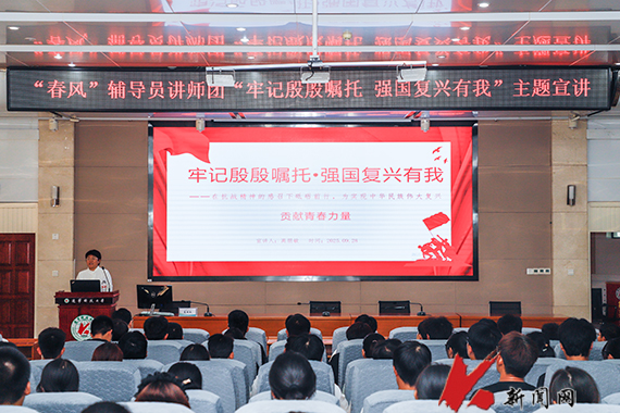 讲师团成员赵智博以抗日战争胜利80周年的时代启示切入,从担负历史重任;锻造中流砥柱、铸就不屈脊梁;激扬爱国情怀、保持战略定力;坚定必胜信念、团结就是力量;奋斗开创未来、坚持命运与共;维护世界和平、弘扬伟大精神、推进复兴伟业6个方面深刻阐述了伟大抗战精神的时代价值与现实意义,通过与学生重温习近平总书记对当代青年的深情寄语,引导青年学子从历史中汲取奋进力量,勇担时代使命,在实现中华民族伟大复兴的征程上挺膺担当、砥砺前行,做有理想、敢担当、能吃苦、肯奋斗的新时代青年。